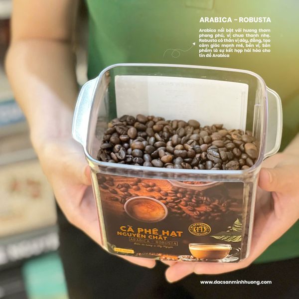 Arabica - Robusta, Arabi ca nổi bật với hương thơm phong phú, vị chua thanh nhẹ. Robusta có thân vị dày, đắng, tạo cảm giác mạnh mẽ, bền vị, sản phẩm là sự kết hợp hài hòa cho tín đồ Arabica.